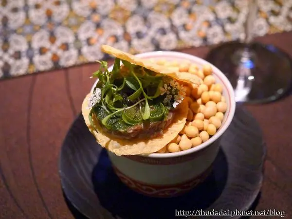 第二道以黑鮪赤身塔塔,搭上香菜苗與香菜葉佃煮物,用蘋果醋調味,