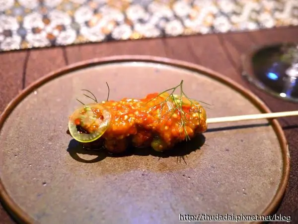 第三道是蒲燒鰻串,上頭為茴香與風乾番茄製作的調料,那層鋪上去的味道十分鮮明,