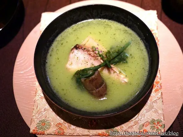 第四道午仔魚,湯底有甜豆與海瓜子的鮮味,灑了一些刺蔥,
