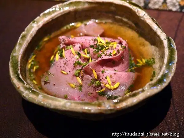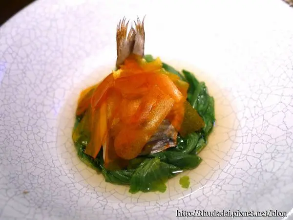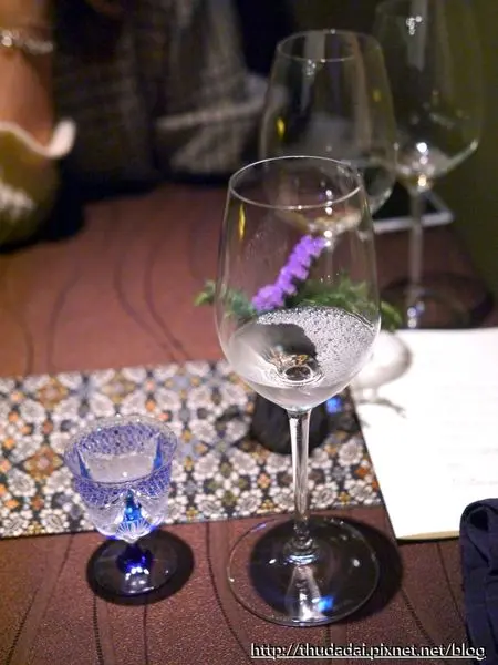 底部是魚骨高湯與茼蒿,使用了一些紫蘇提味,佐酒是Beau Michelle,