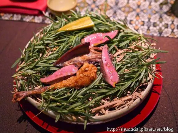 第八道乳鴿,上桌時帶來了濃濃的煙燻氣味,那塊骨頭底下是木炭,鋪上迷迭香,