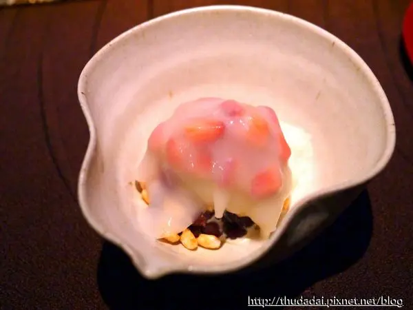 甜點則是以一層麻糬包覆擂茶冰淇淋,加入草莓、米香、紅豆等,