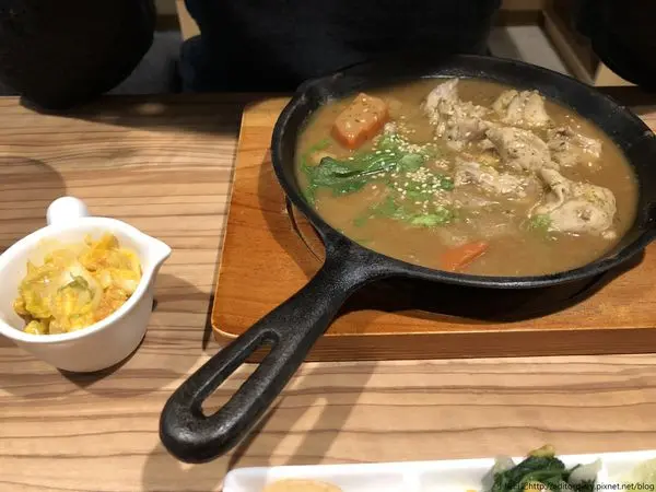 第一位出場的是店家特製的鮮嫩雞腿芋香咖哩(168元),每份咖哩套餐可以選一份泡菜(日式、韓式、黃金),小編果斷選擇了黃金泡菜。除了泡菜以外還有附上一碗白飯跟一碗湯,話說有著芋頭香氣的咖哩還蠻特別的,以前小編蠻不敢吃的,不過近期對芋頭有無以復加的喜愛!