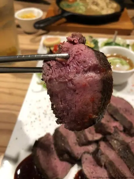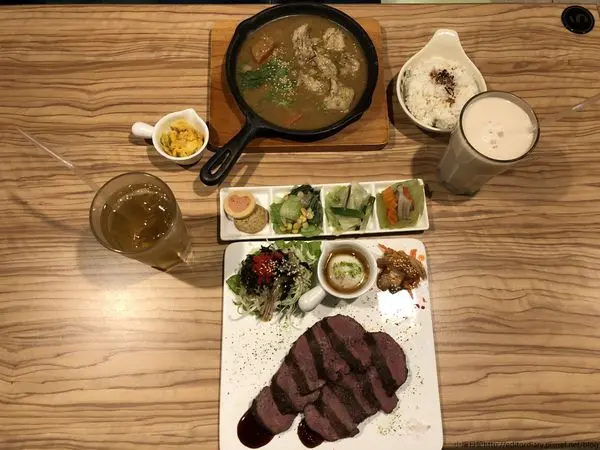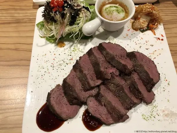 接著是小編點的嫩肩里脊牛排定食(298元),一上桌有驚艷一下,店家在料理跟擺盤上都十分用心,除了有牛排還有一顆溫泉蛋、韓式泡菜、沙拉。不過小編必須要先坦承,本來對於牛排其實有點擔心,畢竟主打定食的牛排合不合口味非常未知數,結果一口咬下,完全掃除疑慮,好好吃!!