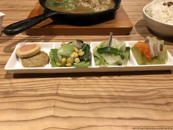 定食的部分還有附上每日配菜四小品,一碗飯跟一碗湯,小菜的部分因為太多青菜了小編沒吃太多,吃了幾口高麗菜覺得還不錯,還有兩塊小餅乾可以當作飯後甜點。