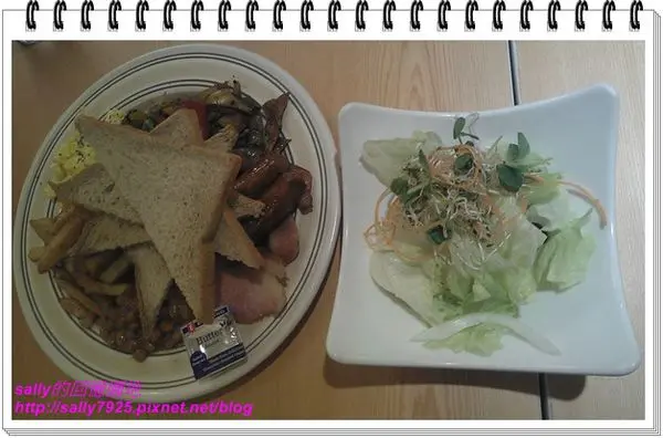 首先上桌的是經典早餐,除了有主餐之外還有一盤生菜,生菜的醬汁吃起來還蠻清爽的,味道不會很重