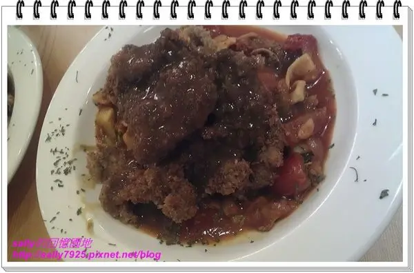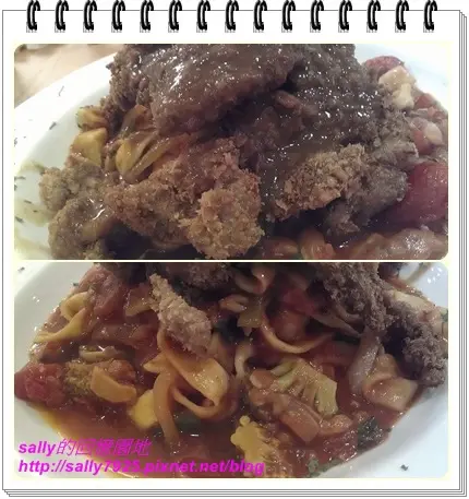這是美式鄉村炸牛排番茄義大利寬麵,上面的炸牛排可不是薄薄的一片喔,很大一片而且還蠻厚的,吃起來很鮮嫩,沒有乾乾的口感,肉汁都鎖在裡面了,真的是鮮嫩多汁喔!
