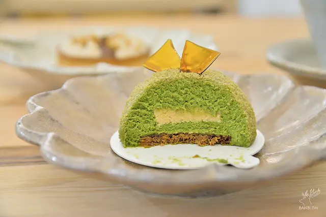 上方是焦糖糖片,抹茶幕斯口感細滑,抹茶味重,甜度不會太高,裡面更夾雜了香濃的焦糖醬,底部則是香脆的塔皮。
