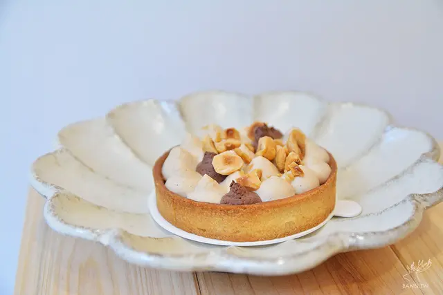 酥脆、乾淨爽口的塔皮,夾雜了一層濃郁的巧克力餡,上方則是榛果奶油、巧克力奶油與許多榛果粒。