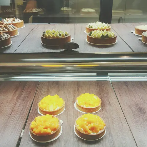 雖然因為還算是在試營運期間,所以甜點種類並不多,不過很幸運的今天櫃上每樣甜點都還有一兩個,剛好可以任我挑選。每種都太吸引我了,聽完店員的介紹,我還是選擇障礙症發作,一口氣點了三個,分別是「山雀」、「苔玉」和試作的芒果慕斯。另外點了一份鹹派「胡椒豬老乾媽辣椒野菜鹹派」還有冰拿鐵。