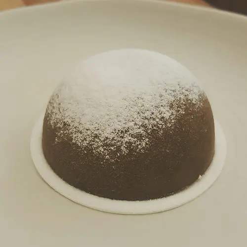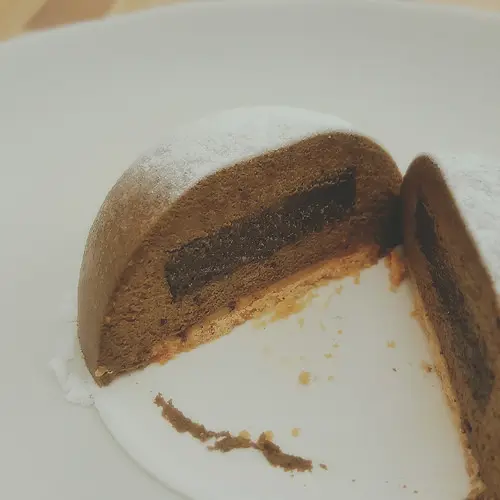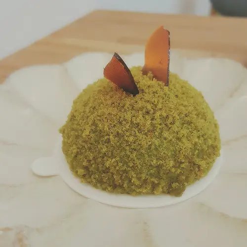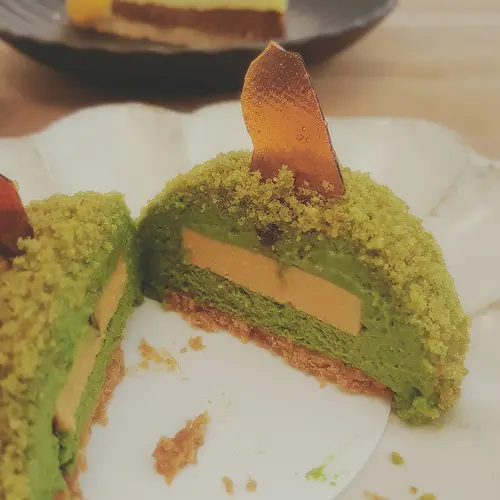 使用宇治森半抹茶製作而成的苔玉,整體是抹茶慕斯,包裹著裡頭一層焦糖慕斯,抹茶香氣重但不苦澀,中間的焦糖慕斯和上方焦糖片正好稍微壓抑住我最害怕的抹茶稠稠苦苦的味道,吃起來溫潤順口,兩者取得不錯的平衡,且焦糖片以及最底部的塔皮也更增添了一些咀嚼的趣味,如此不愛抹茶的我,今天卻意外的最喜歡這道甜點。