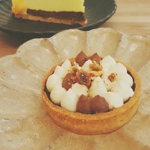 印象中通常搭配起來甜度都會過高的這兩種元素,木白卻在香氣和甜度中取得容易被接受的口味,中間內餡的生巧克力的濃郁滑順、上方的榛果鮮奶油香氣充裕,加上些許榛果仁和底部爽脆的塔皮,即便和其他產品相較之下甜度當然還是較高,不過毫不膩口,仍然很討喜。