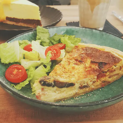鹹派旁還附有簡單的生菜沙拉,更能填飽肚子且營養均衡(笑)而鹹派本身味道我很喜歡,用料上吃來口感不錯,能嚼到豬肉塊還有香菇等蔬菜丁,尤其是帶著適中的辣度,不慍不火很是滿足。惟派皮的部份比較不合自己口味,派皮較軟韌,感覺和餡料在一起咀嚼起來沒存在感,不過這是個人口味問題,所以不影響。