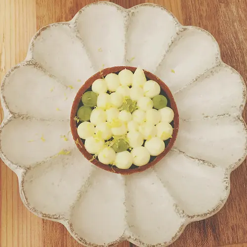 塔皮的內裡是抹茶生巧克力內餡,上方水滴狀則是檸檬卡士達,比起「苔玉」,自己反倒覺得「向陽」的抹茶味更加濃郁,可能是因為是以生巧克力的方式呈現,所以口感上比較黏稠;不過上方檸檬卡士達的酸味悄悄的將抹茶的苦味和粘稠口感中和,進了喉嚨後非常滑順,且這樣的搭配也是較少見的,整體吃起來很清新。