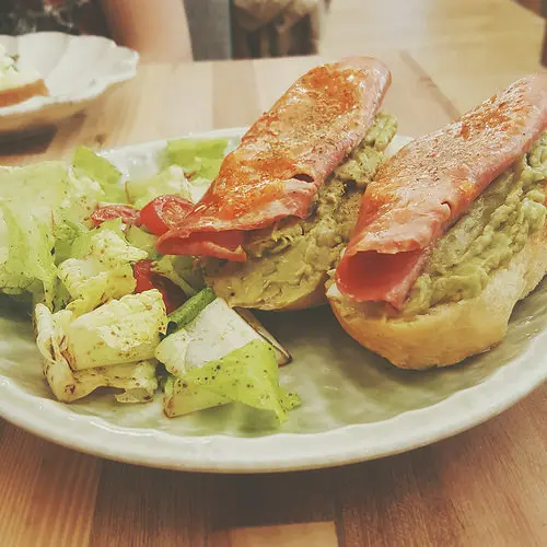 和鹹派一樣,在一旁附上了簡單的生菜,而在軟法上放上了拌入碎蛋的酪梨洋蔥泥和煙燻牛肉。軟法口感挺有嚼勁,搭配上涼涼的酪梨泥別有一番風味;酪梨的綿密口感裡偷偷夾雜了的洋蔥味很點睛,再加上碎蛋的蛋香味,讓層次變得豐富。