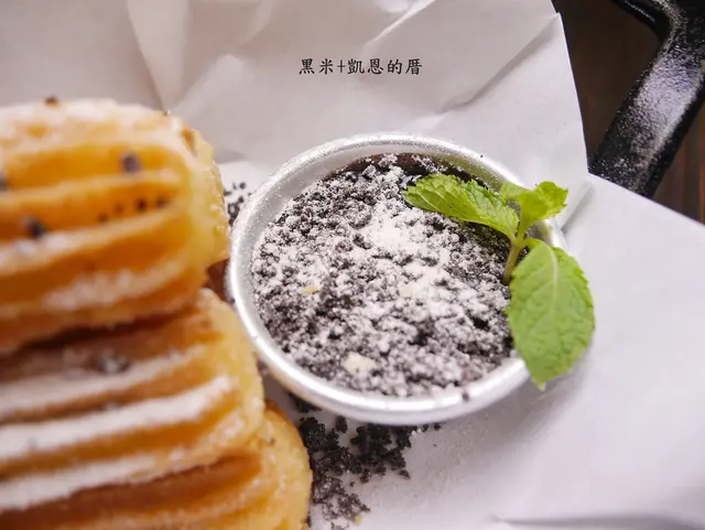 吉拿棒用小鑄鐵鍋盛裝並附上一碗巧克力醬