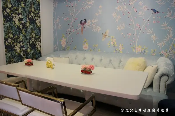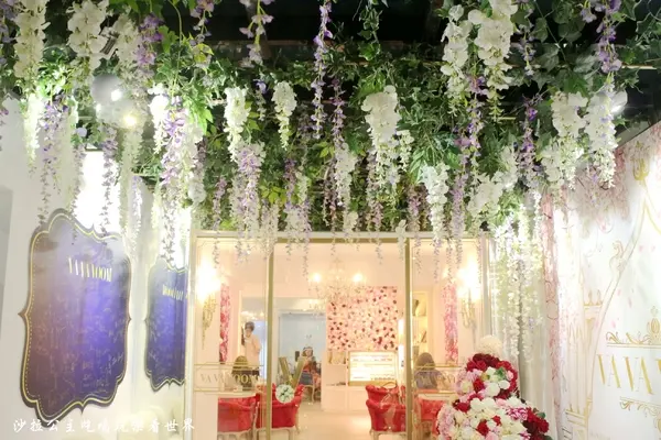 推開門後兩旁的花牆以玫瑰花做裝飾,搭配著大紅色舒適的沙發椅,能在這裡用餐真的好浪漫啊