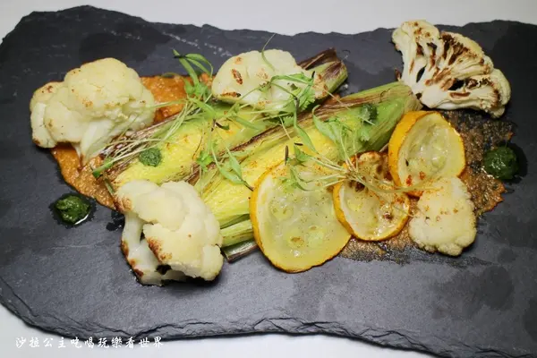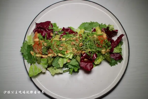 這道沙拉由辣味豆腐乳、紹興酒、蘋果醋、冷壓初榨橄欖油、紅辣椒油、麻油、鐵塔-鮮乳脂組合而成