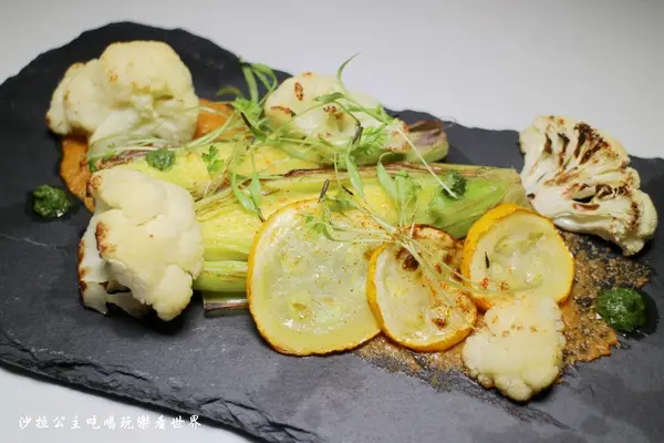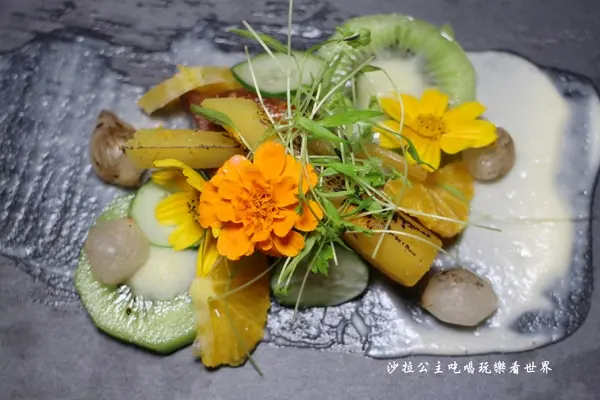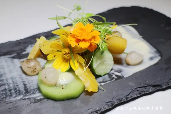 猶如一座花園被端到面前,裡面有醃漬黃蘿蔔、炙烤醋漬迷你洋蔥、奇異果、蜂蜜橘子、冰鎮小黃瓜薄片