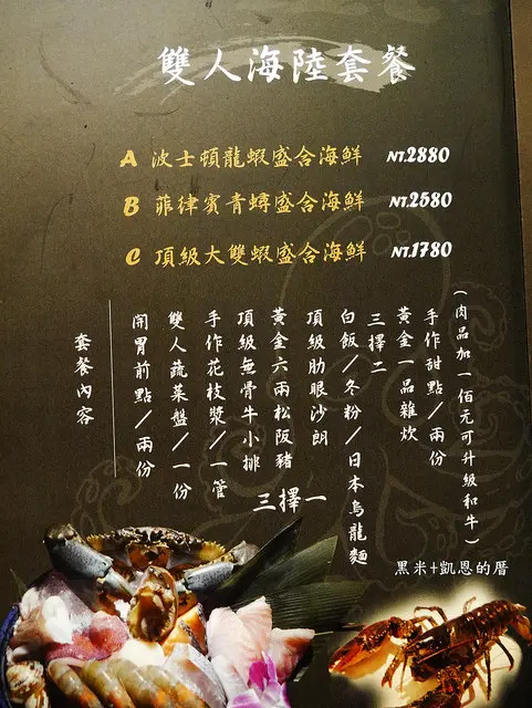 雙人海鮮套餐有波士頓龍蝦/菲律賓青蟳/頂級大雙蝦三種組合