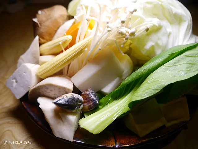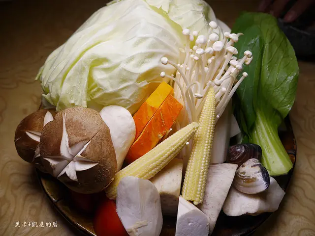高麗菜、南瓜、香菇、金針菇、玉米筍、豆腐、芋頭、蝦蠣、番茄、山藥、青江菜