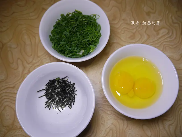 等會要加入的雞蛋、三星蔥末、海苔絲