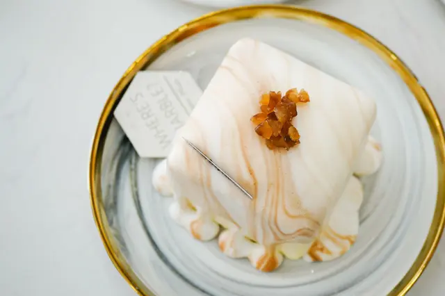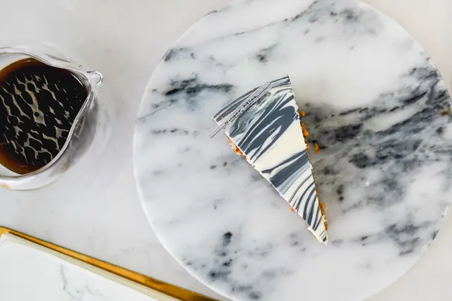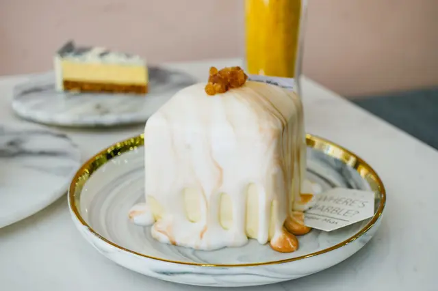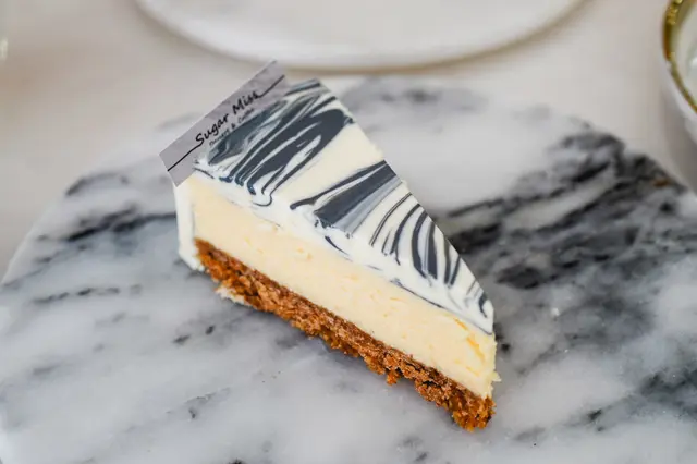 簡直是藝術品般的黑白大理石乳酪蛋糕。表層是竹炭大理石乳酪凍,酸甜檸檬及優格的香氣,入口滑順綿密,中間為經典重乳酪,奶香濃郁帶有微微乳酸風味,底層的餅乾層烤的十分酥香、口感硬脆,在柔滑的蛋糕之中加入衝擊的豐富口感。