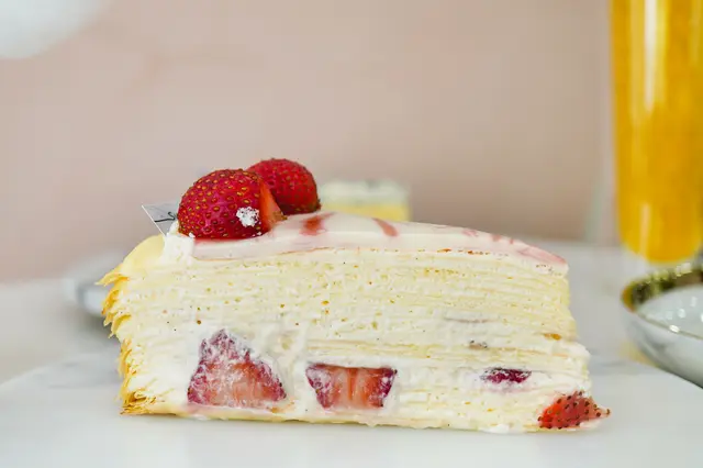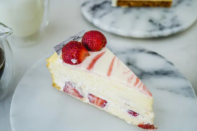 頂層為莓果乳酪凍,千層部分蛋皮厚度堅持維持0.1~0.3 mm,層層堆疊,中間刷上一層又一層的香草卡士達內餡,使得整體口感既綿密又順口。通常來說千層蛋糕易覺得膩口,但酸甜的新鮮草莓切片堆疊在其中以及頂部的莓果乳酪凍有著起司的滋味,使得整體甜膩感恰好的中和,是很有層次感及細緻的千層蛋糕!