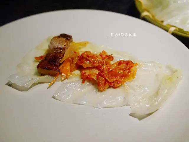 工作人員也示範用燙過的高麗菜夾入一點小菜與五花肉一起吃比較不油