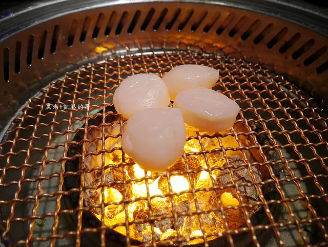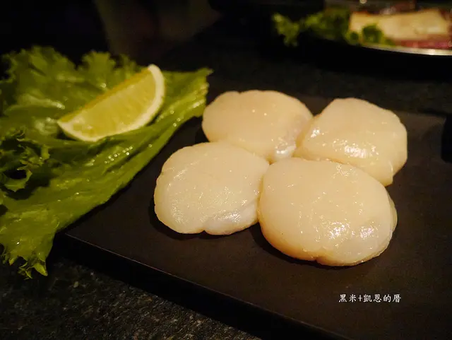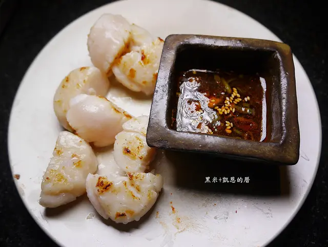 生食級的干貝僅烤到五分熟,一旁的沾醬是沾海鮮的