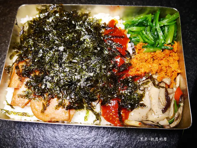 菜色用鐵盒裝好,加入午餐肉、蔬菜、海苔、蛋、醬菜