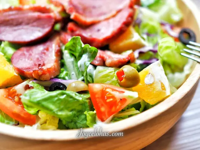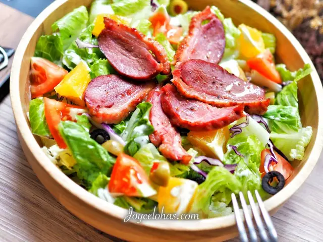大大的木盆盛裝裡面滿滿生菜和配料,有番茄、香橙、橄欖、紫高麗菜,搭配凱薩醬,清脆又爽口。