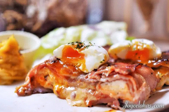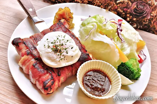 像是變奏版本的考克太太吐司的做法。培根包覆著吐司,夾層濃濃的起司、肉醬和義式香料下去香煎後,上面再放上一顆水波蛋。