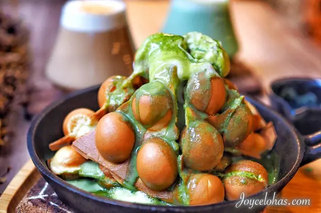 鐵鍋雞蛋仔目前有兩種可以選擇,巧克力和我們這次選的抹茶,另外也可以加價做成竹炭 or 麻糬口味 $20 。