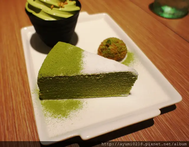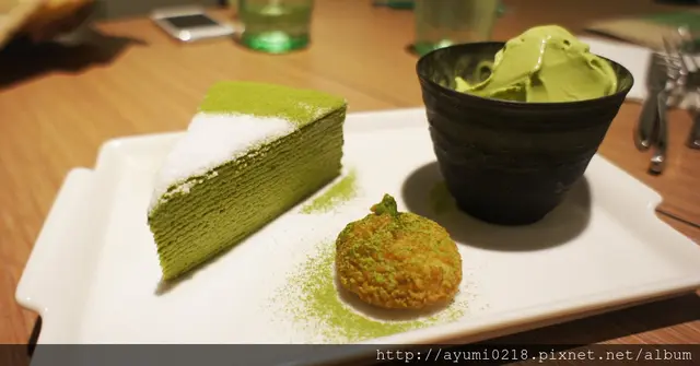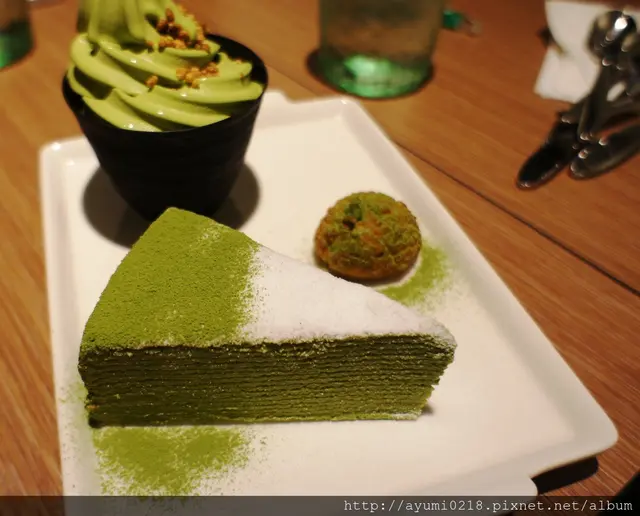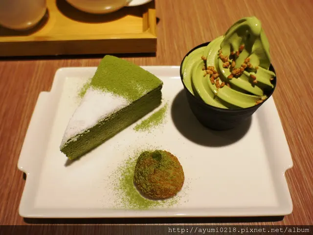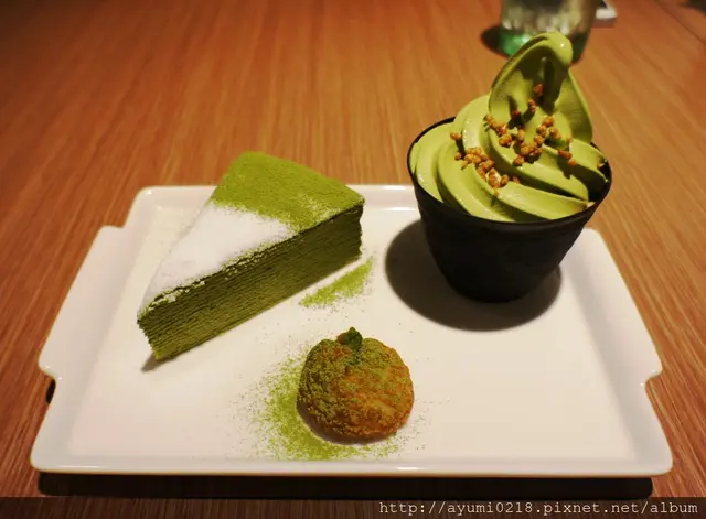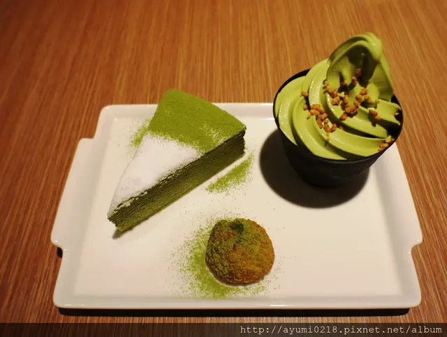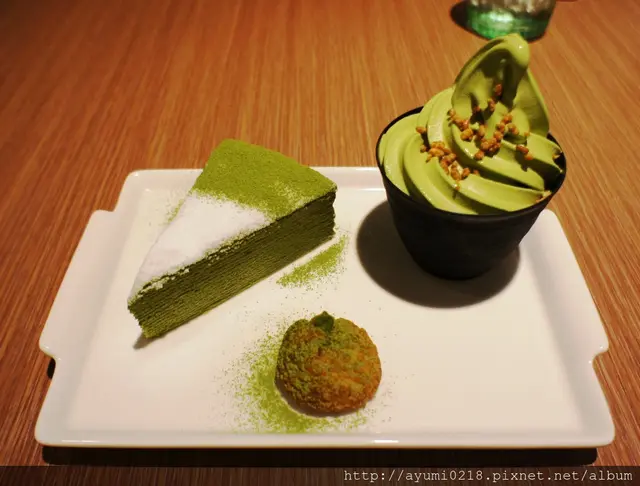 抹茶蛋糕上頭細膩的白糖~讓整個蛋糕變成藝術品而霜淇淋上頭的酥脆米果~也是增添了脆脆的口感