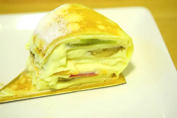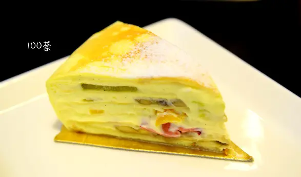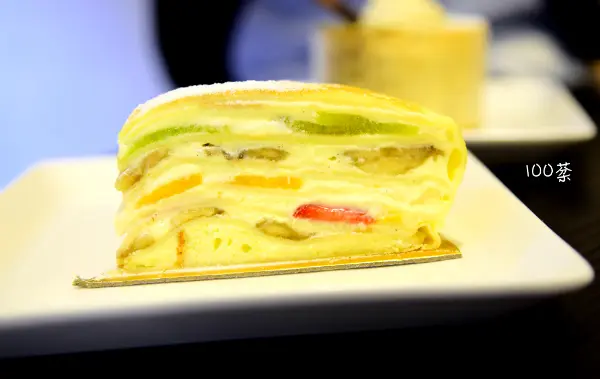 招牌水果千層蛋糕的餅皮是手工一層一層煎出來堆疊的,