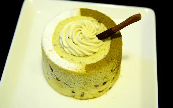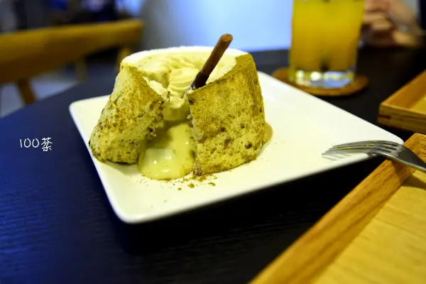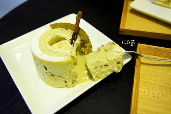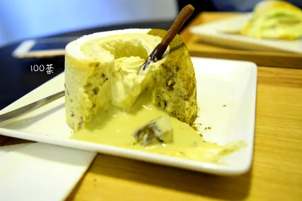 而這裡整塊的蛋糕體中間更填入了焙茶卡士達,在切開的那瞬間流淌而出