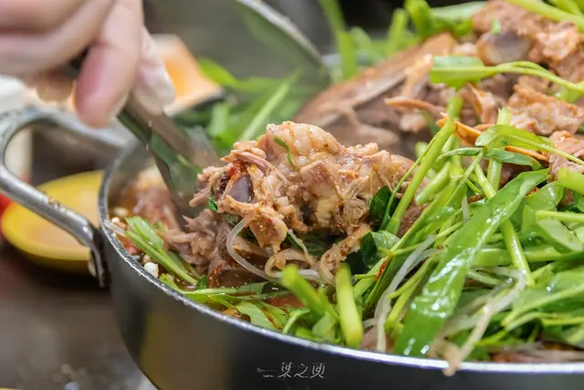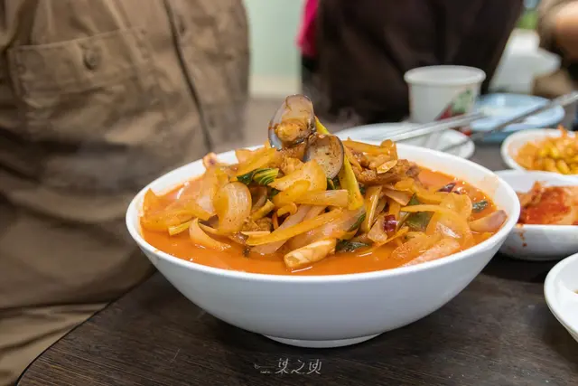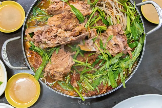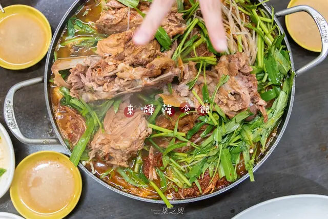 這對我來說就是必點必點必點!東輝的招牌品項也是這道,外頭招牌上就寫著「土豆排骨湯」幾個大字。我們五個人點大份的才夠吃,第一次看到這壯觀的外貌著實嚇一大跳,層層疊疊的空心菜、韓式冬粉、店家特製醃菜及金針菇,太滿足視覺感受。