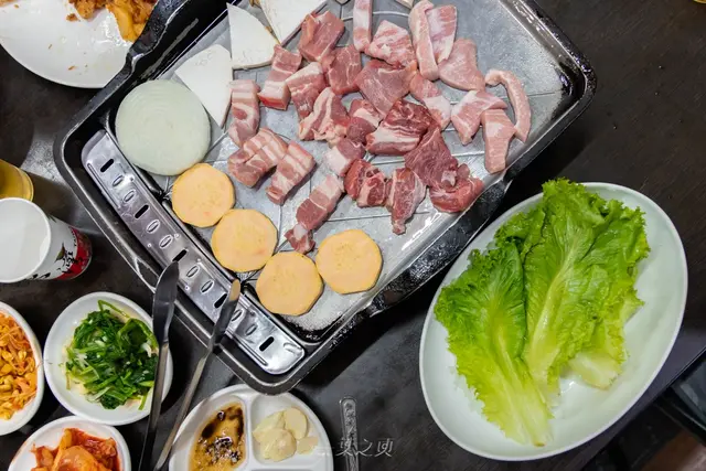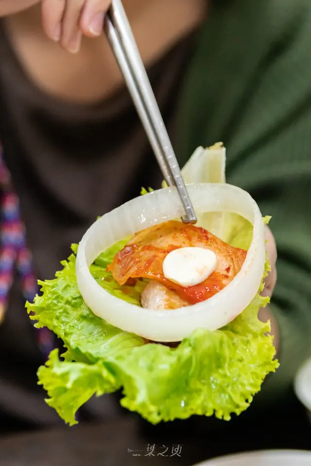 東輝的阿姨會幫忙烤,完全不用自己動手,還很貼心的會教導最道地好吃的吃法,表面烤得微微焦脆的三層肉沾上辣醬、放到生菜上,再疊上泡菜、洋蔥與大蒜,一口塞下真是無比滿足。