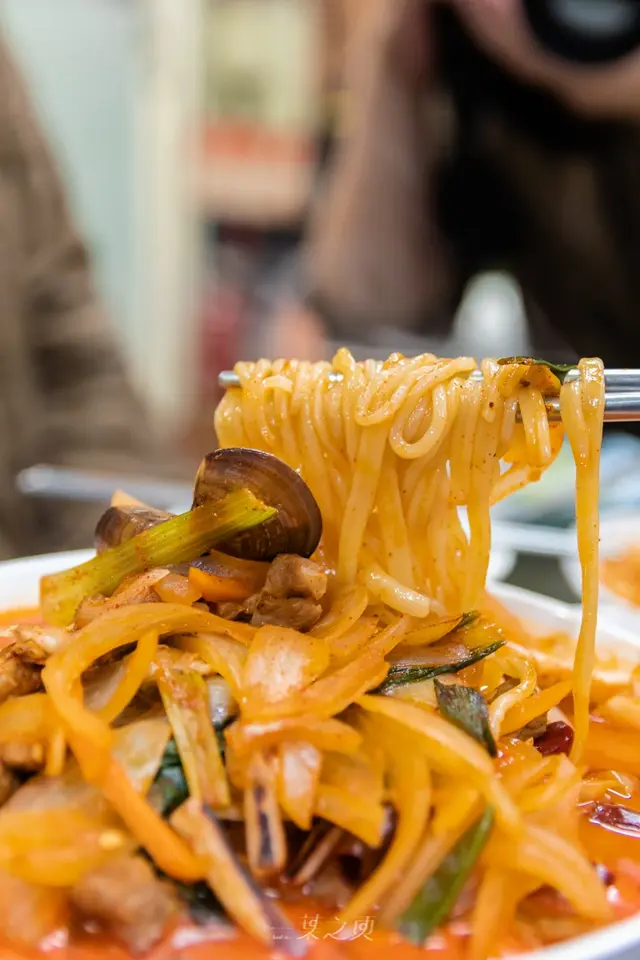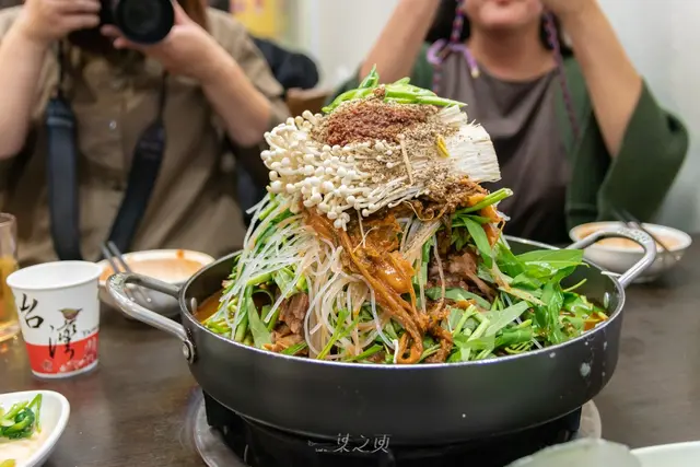 底部則有排骨、馬鈴薯及年糕,趁著這座塔尚未加熱到崩塌之前便是各位搶著拍照之時,慢慢滾起來後,阿姨會過來幫忙處理,淋湯汁軟化蔬菜後再慢慢壓下,特製醃菜和辣醬全部融在湯底,濃郁的湯頭喝來真是太爽快!