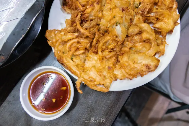 厚實的餅裡頭包裹進蝦子、花枝等海鮮,口感上相當過癮飽足;一旁會附上沾醬,沾醬吃起來鹹香中帶些酸甘氣味,搭配著吃清爽解膩。