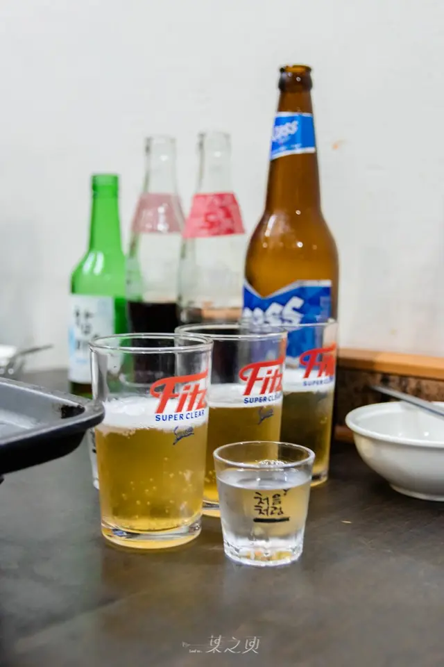 這次我們五人,三個女生因為不用騎車就吵著要喝酒,還想模仿韓劇那樣很厲害的調燒啤,事實是沒有韓國人那樣純熟華麗的手法,但味道一樣美味,燒啤真的很好喝,推薦有喝酒的人一定要試試!燒酒與啤酒的比例為 3 : 7 ,喝起來帶點甜味,很容易意猶未盡的喝上好多杯。