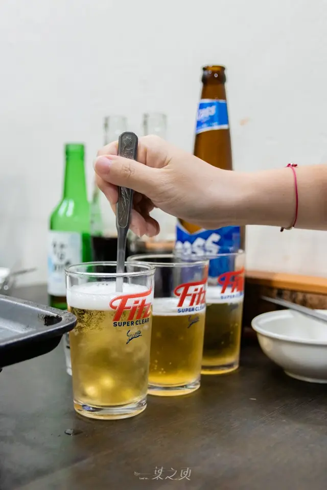 若要做燒啤炸彈,便將燒酒杯丟進啤酒杯裡讓兩種酒混和,看啤酒發泡超療癒的!但因為還有好多杯要喝,我們都是用較柔和的方式--用湯匙大!力!戳!可以起到同樣的效果喔。