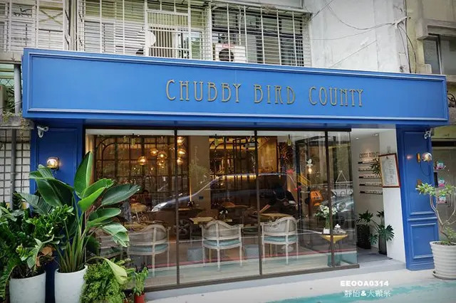 位於松山區長壽公園旁的Chubby Bird Count ,藍色的招牌好醒目,透明的落地窗讓人可以一窺室內環境,門口有菜單可以參考