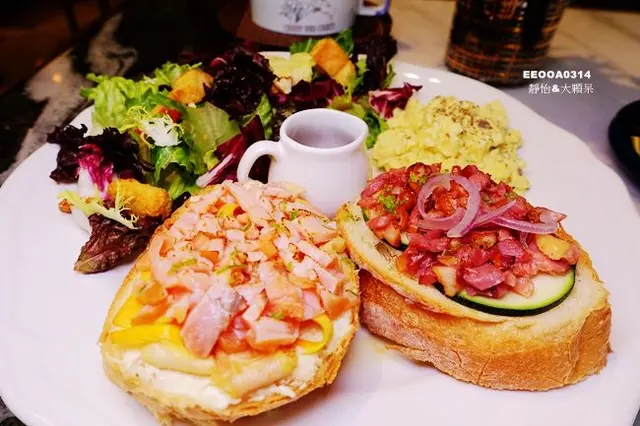 選擇了一份早午餐,早午餐有四種口味,一份可以任選兩種.另外搭配了生菜沙拉及炒蛋,這樣一份早午餐擺盤美美的