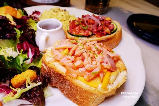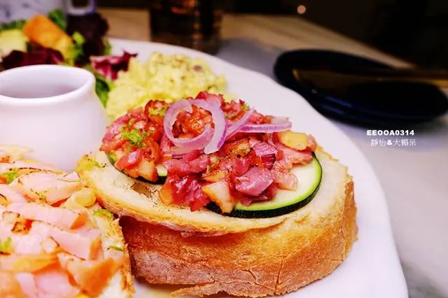 炙燒燻鮭魚&酒醋醃擳瓜及炙燒煙燻鴨&新鮮脆擳瓜,法式吐司上鋪滿滿的料,味道香香的