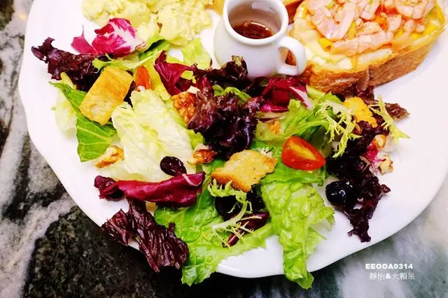 顏色搭配得美美的生菜沙拉,淋上一旁油醋醬清脆爽口,感覺也超健康