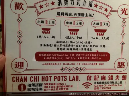 接著我們看到消費的方式,依人數可以選擇小鍋、中鍋、大鍋,也有指定的主菜要點數量,全部都是單點性質,不過有附上基本的鍋底料。