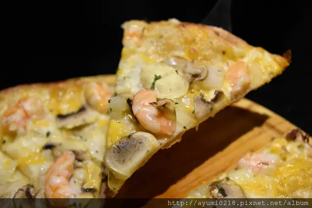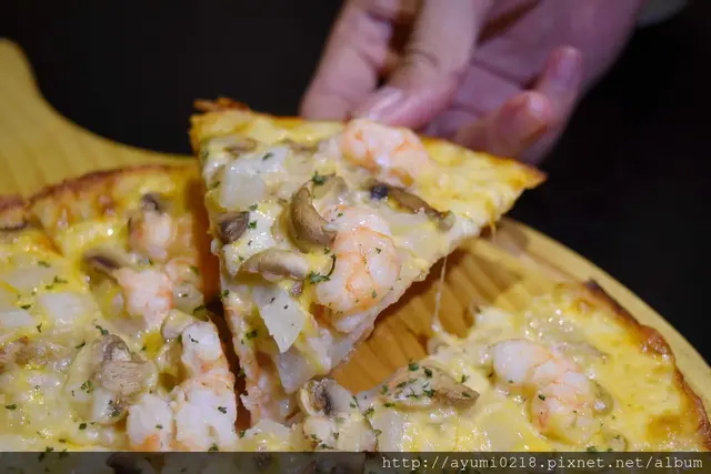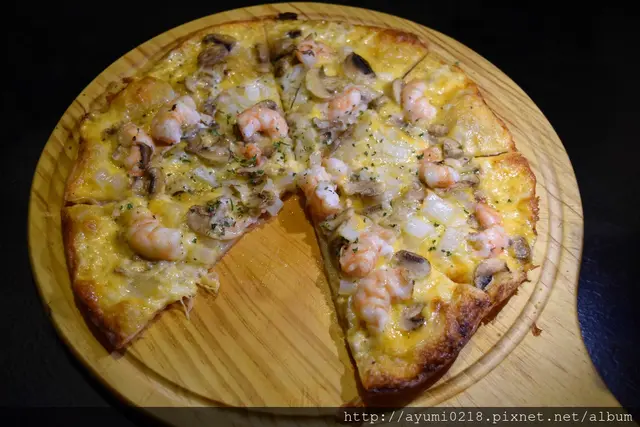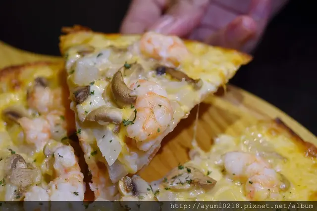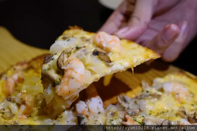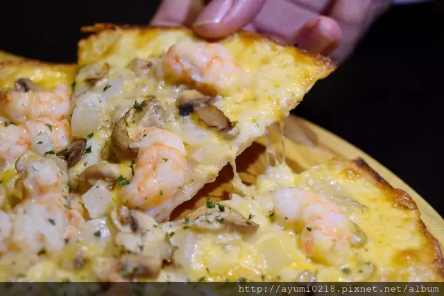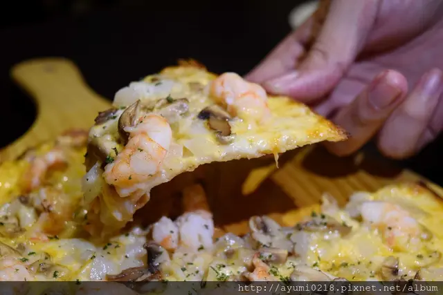鮮蝦的鮮味/洋蔥的甜/起司的香/餅皮的薄脆像點心