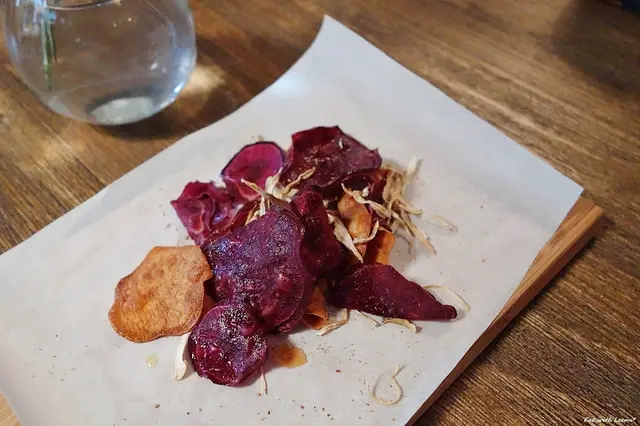 每桌都有的招待點心,是幾種不同的薯片與杏鮑菇烘乾製成,沒有下多餘的調味簡單好吃,其中杏鮑菇還帶點微妙的彈性,口感較為特別。